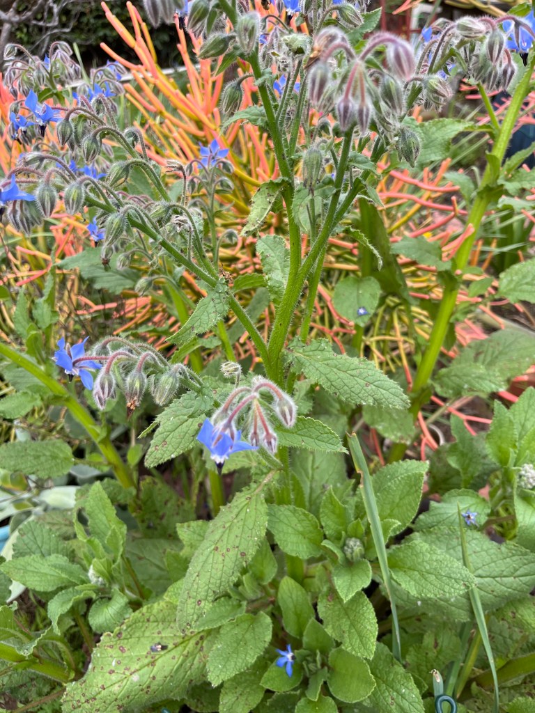 The rain has gotten all my freesias blooming. I feel like we are a month away from more flowers like the red clover and some of the early spring flowers blooming like to borage above mixed in with firesticks. Once that happens, the bees will pick up. Because I disperse several kinds of seed mixes for the bees, butterflies and birds, I never know what I am going to get as all the seeds don’t take. I like it that way. It becomes more like a meadow than cultivated garden.