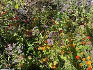 The bees are very happily buzzing around all the borage I planted. The borage flowers are wonderful to pick and add to salads, just like my nasturtiums that they are mingling with. For me, leaning forward to pick them is not a great idea yet. The grass sprouts up between the plants but I can’t pull them right now either. They will have to be part of the mix.