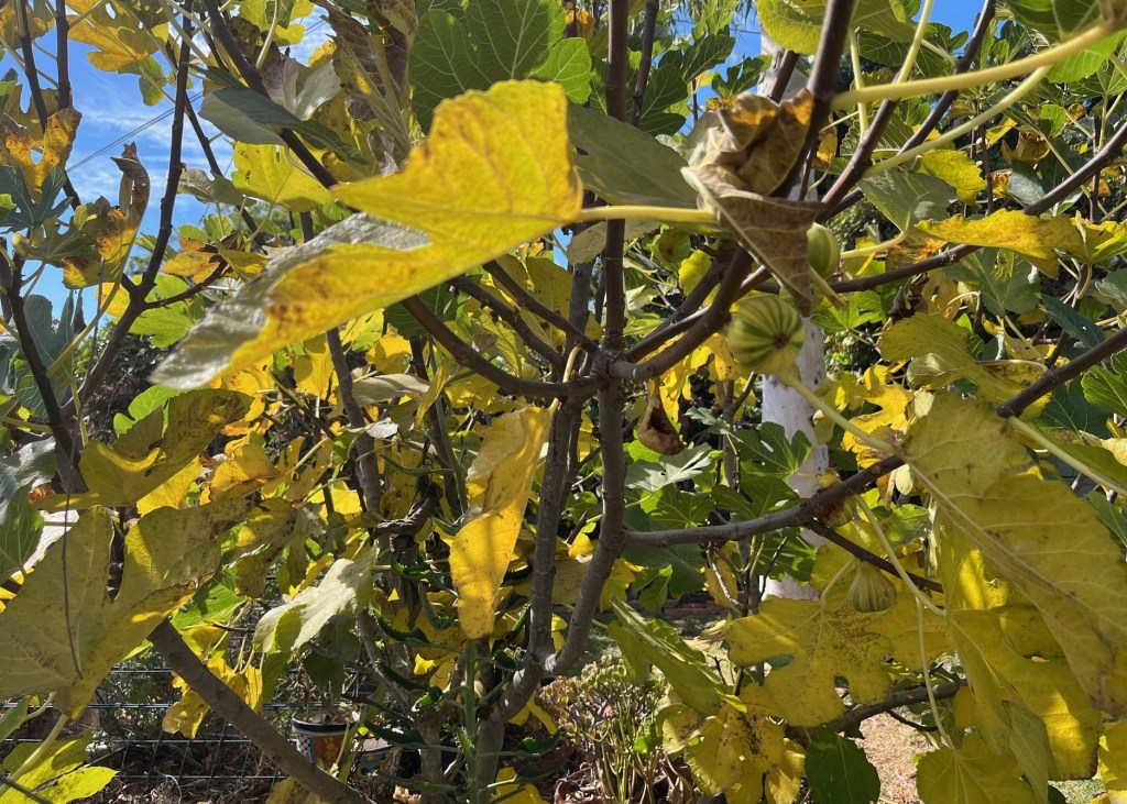Upon coming home, I noticed my Tiger Stripe Fig tree leaves were also turning a beautiful yellow. We continue to get figs, and I think they will last well into November this year. I love to see the persimmon trees around town. The persimmons are drooping their bright orange fruits heavy on the branch while the leaves are falling off.