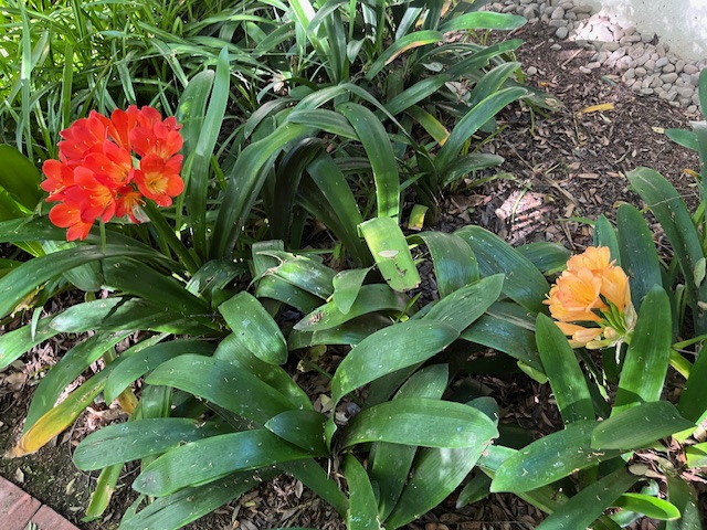I noticed a hummingbird looking for a place to nest. She was checking out the trees in my front yard which looks especially appealing right now. The Clivias are blooming and one is a slightly lighter orange than I have ever seen. You can see the two shades below. They are putting on such a show this year with more blooming than usual. I wonder if that is what is attracting the hummingbirds.