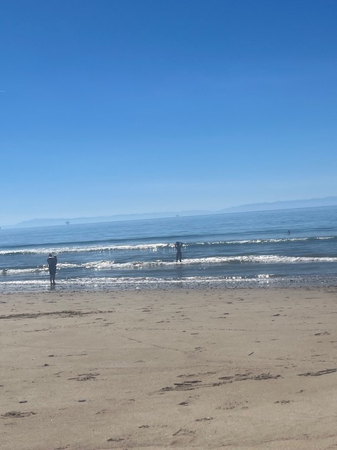 After my last post, I did go to the beach the next day. It was 85 but even stranger for Feb 28th was the beach itself. Maybe the early in the year storms deposited a ton of sand here, but whatever caused it, you could walk out for a long way and not even be up to your knees. This is probably why everyone said the water was warm; it was shallow. I can truthfully say I have never walked into the water up to my knees in February before. It is always too cold. This was a strange occurence. There were no waves at all, perfectly flat. And the water was so clear. From the shore, we watched little kids be able to walk out so far. So many people were in the water that day without a wetsuit in sight.