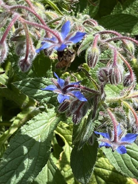 Back in my own yard, the bees were feasting. Here is a closeup of a bee feasting on my borage plant. They are so gentle right now.